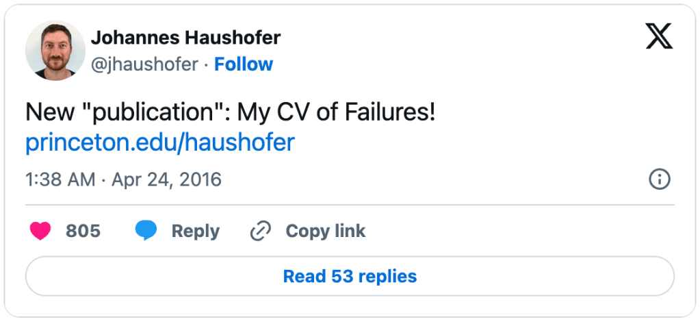 Now a Prof. of Economics and Public Policy at Cornell University, Haushofer wanted to change the academic game by showing that even esteemed figures and so-called high achievers have faced significant setbacks. His goal was to “motivate folks to keep pushing on, even when faced with setbacks.”